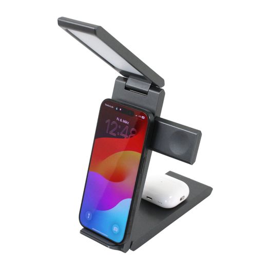 Die Universal 4-in-1 Wireless Charging Station ist eine elegante All-in-One-Lösung für Ihren Nachttisch oder Schreibtisch. Das multifunktionale Modell ermöglicht das simultane, kabellose Laden von iPhone, Apple Watch und AirPods. Gefertigt aus hochwertigem, feuerfestem Material in Metallic-Optik, besticht die Station durch ihr minimalistisches Design. Ein besonderes Highlight ist die integrierte LED-Leuchte mit einer 3-stufigen Helligkeitsregelung, die per Ein-Knopf-Bedienung gesteuert wird. Dank moderner Qi-Technologie und integrierten Schutzfunktionen gegen Überhitzung und Überladung garantiert dieses Modell eine sichere und effiziente Stromversorgung für Ihre gesamte Apple-Peripherie über einen zentralen USB-C Anschluss.
