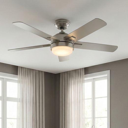 Der mattsilberne Hunter 51778 Zeal (132 cm) vereint leisen Deckenventilator und Leuchte in einem modernen Design. Inklusive Fernbedienung steuern Sie bequem drei Geschwindigkeiten sowie das Licht, während der Sommer-/Wintermodus ganzjährig für effiziente Luftverteilung sorgt.