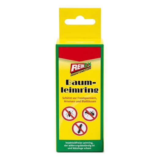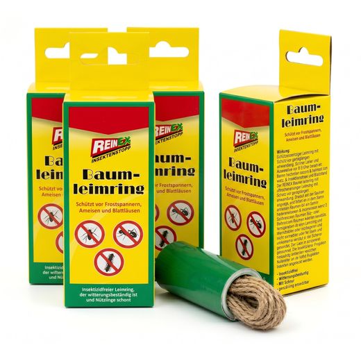 Gebrauchsfertiger Leimring mit Schnur zur ganzjährigen Anwendung. Schützt Laub- und Obstbäume vor Schäden durch am Stamm hochkriechende Schadinsekten wie z. B. Frostspannern oder Blattläuse. Der REINEX Baumleimring ist ein gebrauchsfertiger Leimring mit Schnur zur ganzjährigen Anwendung. Er wird um den Stamm angelegt und bildet eine nicht-überwindbare Barriere für am Stamm hochkriechende Schadinsekten wie z. B. Frostspanner, Raupen, Blut- oder Blattläusen. Ameisen werden ebenfalls ferngehalten, so dass Nützlinge wie Marienkäfer- oder Florfliegenlarven nicht vertrieben werden. Laub- und Obstbäume werden so vor Schäden geschützt. Der Leim ist witterungsbeständig und insektizidfrei. Die grüne Farbe des Leimrings minimiert Nebenfänge, da keine fliegenden Insekten angelockt werden.