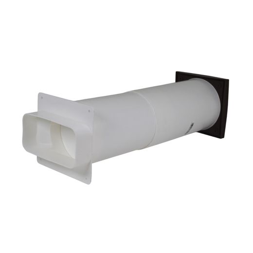 Teleskop-Rundrohmauerkasten der Marke Airtec in Weiß/Braun mit einem Durchmesser von 100 mm, mit Rundabschluss und Rückstauklappe. Teleskoprohr 270 - 480 mm.