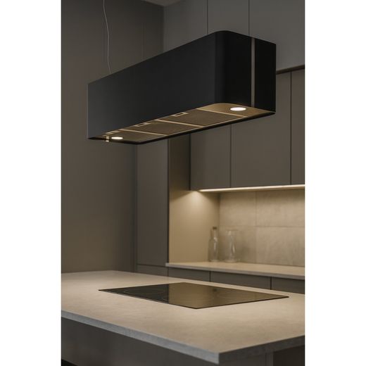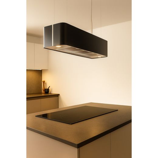 Elegante Inselhaube in Schwarz/Edelstahl mit Umluftbetrieb und leistungsstarker Absaugung bis zu 760 m³/h (IEC). Der lackierte Metallkörper mit polierten Edelstahlakzenten misst 100 × 35 × 28 cm und hängt an bis zu 140 cm langen Seilen. Die integrierte LED-Beleuchtung (2 × 2,1 W, 4000 K) sorgt für natürliches Licht über dem Kochfeld. Gesteuert wird die Haube per Fernbedienung mit 3 Leistungsstufen plus Intensivmodus. Die Betriebslautstärke liegt zwischen 50 und 69 dBA. Drei Edelstahl-Fettfilter und drei Kohlefilter sind im Lieferumfang enthalten.