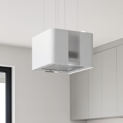 Airforce F181 Aria Inselhaube mit Fernbedienung in Weiß mit spiegelnd polierter Edelstahlfront.