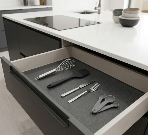 Diese praktischen Einlegematten sorgen dafür, dass Geschirr, Töpfe und Küchenutensilien sicher in der Schublade liegen bleiben. Die rutschhemmende Oberfläche verhindert das Verrutschen beim Öffnen und Schließen von Schubladen oder Auszügen.