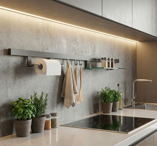 Das HKT Relingset Linea überzeugt durch sein modernes, klares Design und hohe Funktionalität. Die elegante Küchenleiste in Anthrazit fügt sich harmonisch in zeitgemäße Küchenkonzepte ein und setzt stilvolle Akzente an der Wand.