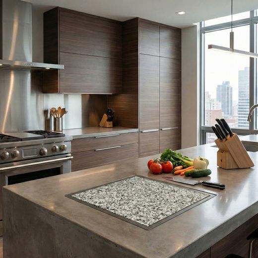 Sie ist hitzebeständig, kratz- und schnittfest sowie feuchtigkeitsresistent und eignet sich ideal als Abstellfläche für heiße Töpfe oder als strapazierfähige Erweiterung neben dem Kochfeld. Die Oberfläche ist pflegeleicht und hygienisch.