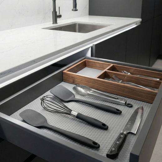 Sorgen Sie für sicheren Halt und perfekte Ordnung in Ihren Schubladen: Die Antirutschmatte mit Noppenstruktur schützt Oberflächen zuverlässig und verhindert das Verrutschen von Besteck, Geschirr, Vorratsdosen oder Werkzeugen.